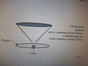 Пока есть люди, искренне преданные Идее, она не захоранивается, т.е. не уходит из сознания человечества. При этом она сохраняется как Автономный Свет, отделена од других Искр. Так, для многих не очевидна связь между наукой и искусством или общественной жизнью. Также далёкой может казаться Искра от Торы, особенно если человек судит по словам и поведению отдельных религиозных людей. На практике, особенно в процессе выбора жизненного пути, это может поставить человека формально перед выбором типа Тора или наука, Тора или искусство и т.п. На самом деле в Торе (Точка на рис.2) скрыта информация о всех Искрах Святости, но там они находятся как бы в сжатом виде. Для полного раскрытия Искры ей необходимо пространство, а это возможно только за счёт пространства Холь. Пока Искры раскрываются в пространстве Холь, как было описано выше, сознание разделёно на ячейки, что лишает человека цельной картины мира. Также не очевидно Б-жественное происхождение этих Идей.
